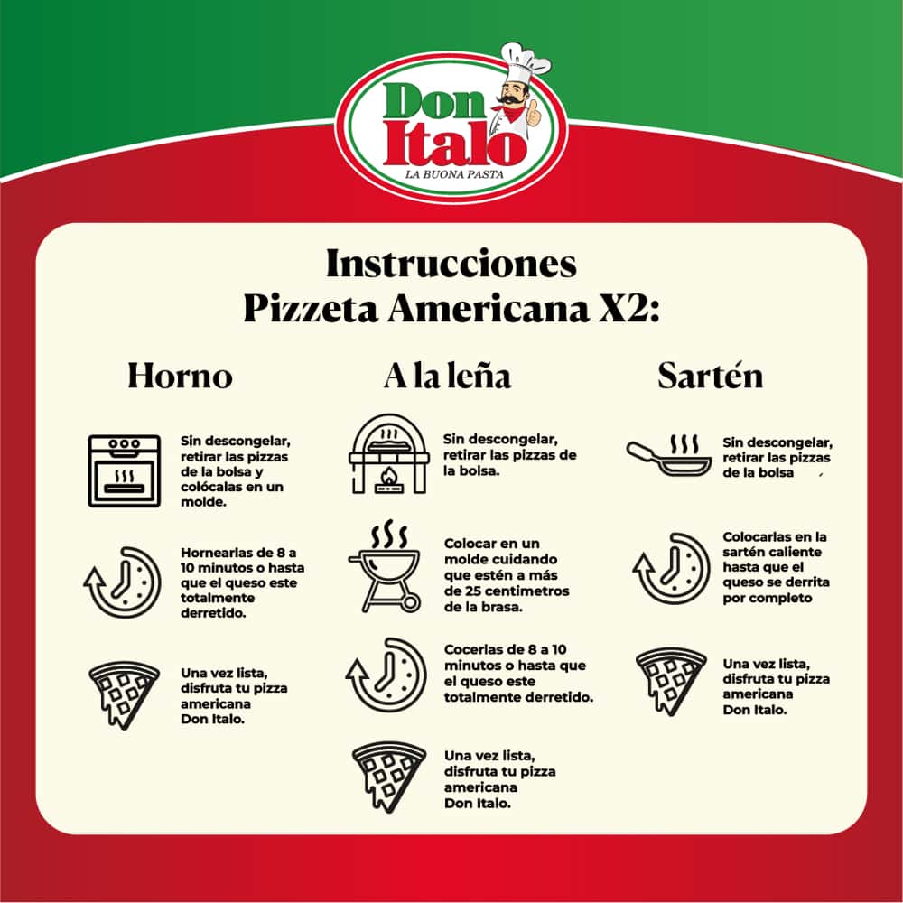 Horno Convencional: Pre calentar el horno a 350°F(176°C). Sin descongelar, retirar las pizzas de la bolsa y colocarla al centro del horno para una cocción uniforme