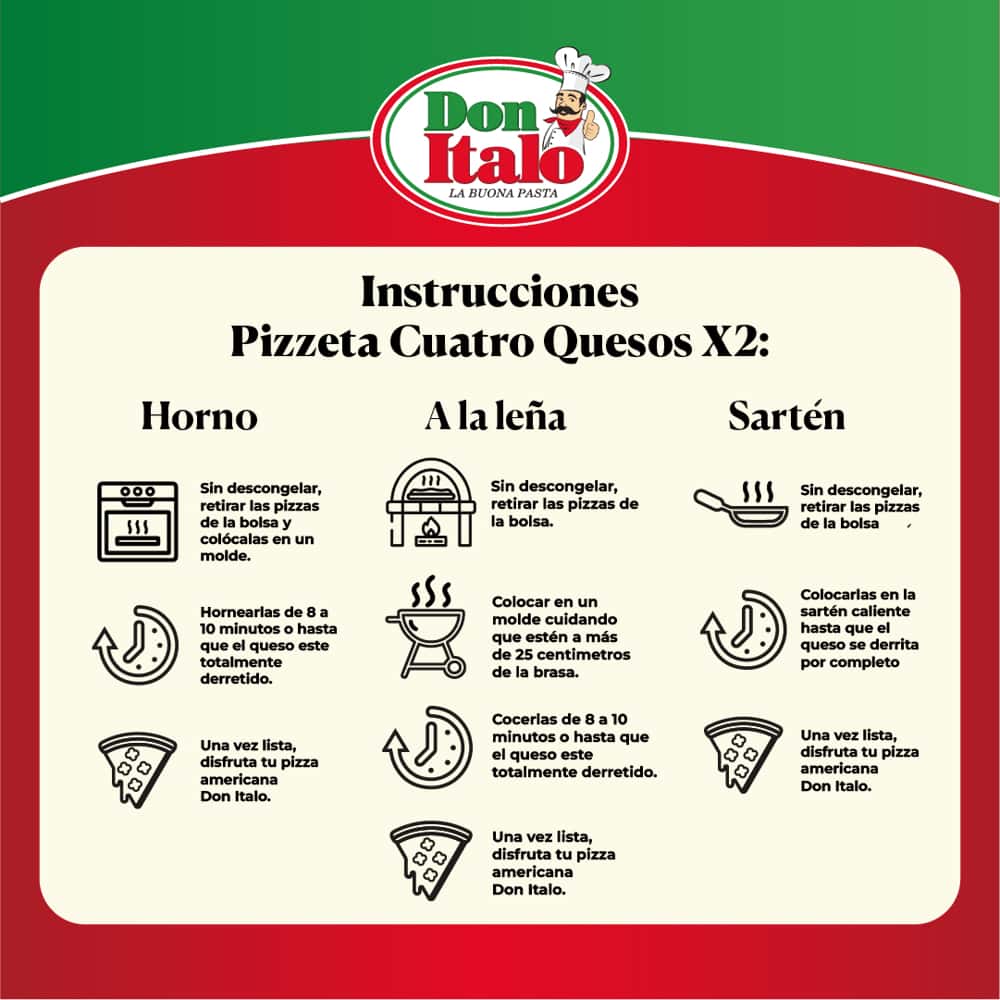• Horno Convencional: Pre calentar el horno a 350°F(176°C).  Sin descongelar, retirar las pizzas de la bolsa y colocarla al centro del horno para una cocción uniforme